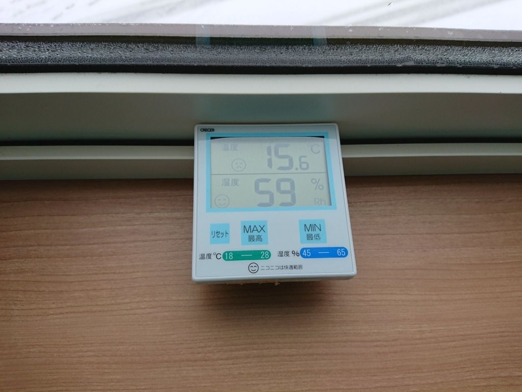 はい、結果。なんとたったの15.6度。こりゃあ寒いわな。湿度も59%ある。ウイルスを抑えるにはかえっていいかもしれない。ちなみに廊下の方は